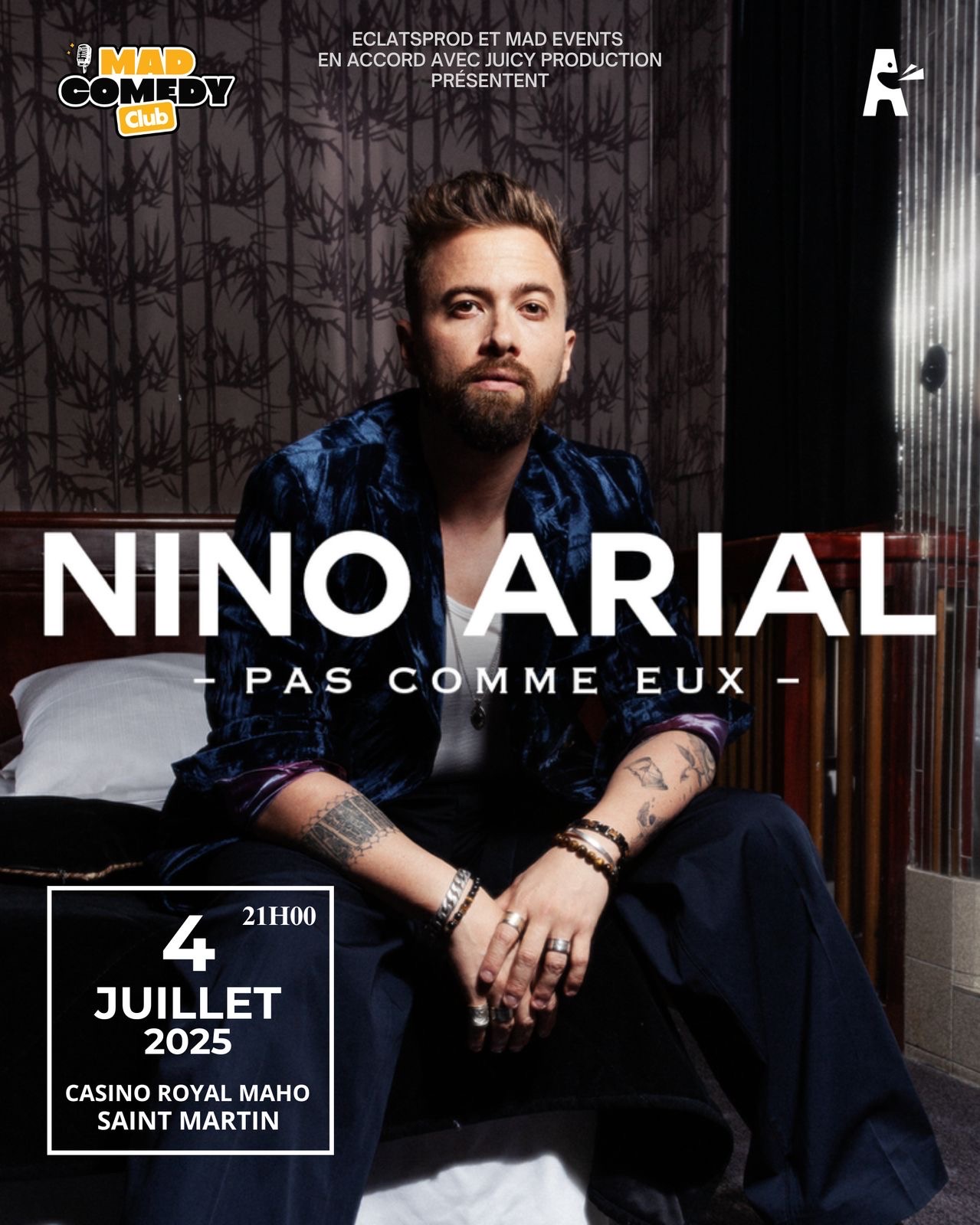 ✨ MAD COMEDY CLUB – LE VRAI DÉPART AVEC NINO ARIAL ! ✨ 🎭 Après un premier lancement avorté, Mad Events revient plus déterminé que jamais avec la première vraie édition du Mad Comedy Club, et cette fois… le show aura bien lieu ! Rendez-vous le vendredi 4 juillet à 21h au Casino Royal pour un One Man Show explosif avec Nino Arial ! 🔥 Qui est Nino Arial ? 🔥 Chroniqueur acerbe et humoriste engagé, Nino Arial s’est imposé avec ses vidéos virales, ses punchlines percutantes et son humour sans fil...