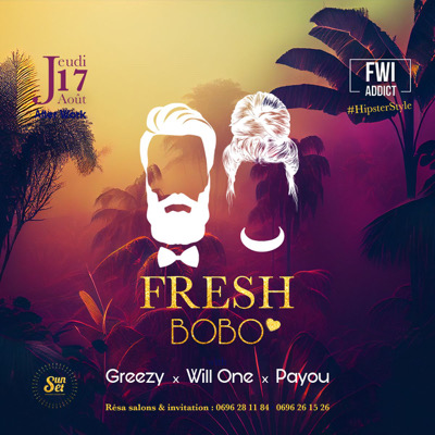 🌸- - - *FRESH BOBO* - - - 🌸 by *FWI.Addict* *Ce Jeudi 17 août * (on finit à Minuit, arrive tôt). 🗿au *SUNSET* dès 19h30 directement après le boulot • C'est le rdv des B.O.B.O, Hipster, Yuppies, barbues ⚠️Un seul mot d'ordre impose ton style Urban chic 🚹_ Messieurs : bermuda, Noeud pap,bretelles…_ 🚺 _Mesdames : Urban Chic_ (inutile de vous expliquer ) 🍹-Happy Hour de 19h a 21h30sur les *cocktails* ( 1 acheté =1 offert)_ _Music Urban international & Caribbean_ _*Set Dj by PAYOU x G...