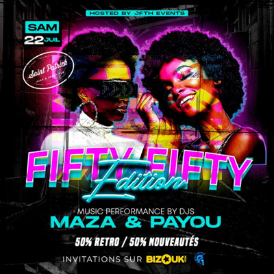 FIFTY/FIFTY Édition 50% RÉTRO / 50% NOUVEAUTÉS Pour voyager entre les classiques en Mode Nosta est les Brand News On remet ça une fois de plus ce Samedi 22 juillet Rdv au St Patrick Bar à partir de 19h avec aux platines : MAZA & PAYOU Tenues et esprits corrects exigés A Samedi Réservation salon : 0696194006 Saint patrick : centre commercial Didier plaza . Fdf .