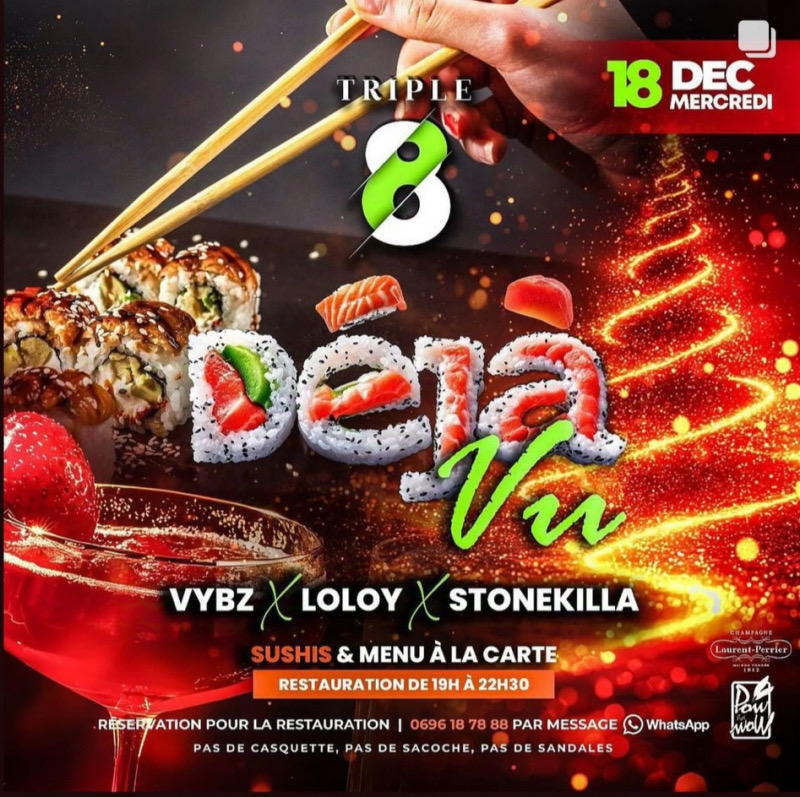 Viens t'exprimer avec tes amis... Sur le Spot qui se décline en Salons ou en Tapis dignes des Mille et une Nuits... pour l'occasion... La Team Ratchèt: Dj VYBZ, Dj STONEKILLA, et Dj LOLOY vont chauffer vos tables et salons. Les Tapas prémiums du Chef Youri ainsi que les Savoureux Sushis du Maître Sushi Valoom Spécialités du mercredi... Des Bulles m'acclament et me réclament ?!!... Déjà, je les déguste Les Duos Champagne : Laurent-Perrier, Jacquart, Collet Uniquement par Téléphone Infos Réserva...