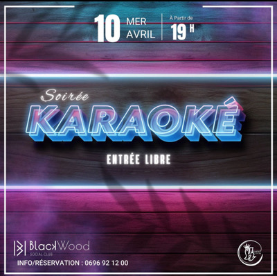 Venez comme vous êtes, apportez votre bonne humeur, vos rires et faire vibrer vos cordes vocales jusqu'à extinction des voix autour d'un verre. Prêts à enflammer tes cordes vocales Libérez l'artiste qui sommeille en vous *. Vas y lâche ta voix Ce Mercredi 10 Avril à partir de 19h . Venez entre amis, en famille, en amoureux, en convivialité. Entrée gratuite Possibilité de restauration sur place : Cocktails Le Blackwood 24 Zone canal cocotte Ducos Infos et résa : 0696 921200