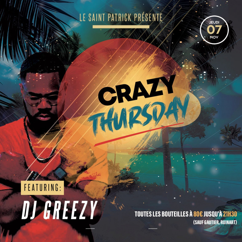 CRAZY THURSDAY Le Saint-Patrick accueille @greezyfwi pour un jeudi de folie. Toutes les bouteilles à 80€ jusqu’à 21h30 (sauf Gautier, Ruinart) Bienvenue dans un monde où les sonorités vous pousseront dans une folie extrême. Prenez vos pass et soyez prêt car ce sera incroyablement chaud.