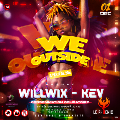 Vendredi 1er Décembre à partir de 20h, pour le retour de la We Outside on T'attend au * Phœnix * pour une nouvelle soirée encore plus pressions avec Dj Willwix DJ Kev Tenue correcte exigée : Pas de casquette , pas de jogging , pas de sandales pas de et pas de short Esprit correct recommander Entrée gratuite jusqu’à 22h30 consommation obligatoire Arrivez tôt !!! Réserve Ton Salon VIP dès maintenant au 06 96 07 35 15
