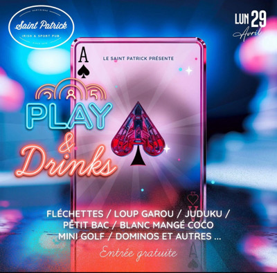 † *PLAY AND DRINK'S* †† le Bar Saint Patrick vous donne rendez vous pour un after work 100% jeux ce lundi 29 avril de 19h à minuit . Une ambiance conviviale, des jeux de société a disposition, Dominos Fléchettes •* UNO, Mini golf et bien d'autres .. St Patrick's Bar : Cc Didier