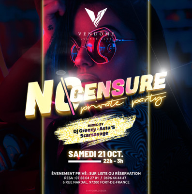 🔞NO CENSURE 🔞 Rejoignez-nous ce Samedi 21 octobre pour la 6eme éditions de la NO CENSURE 🎶L’événement sera animé par trois DJ de la Martinique, Dj GREEZY, Dj SCAR SAVAGE & Dj ASTA’S 📀 🥂Viens nous retrouver au Vendôme de 22h jusqu’au bout de la nuit… pour une ambiance encore plus sensuelle et explosive. N’oublies pas de te mettre sur liste ! ❌ Pas sur liste = Pas d’entrée ❌ 📲 Réserves ton salon VIP au : +33 7 88 04 27 01 Liste valable jusqu’à 1h30 après plus d’entrée !!! Composes...