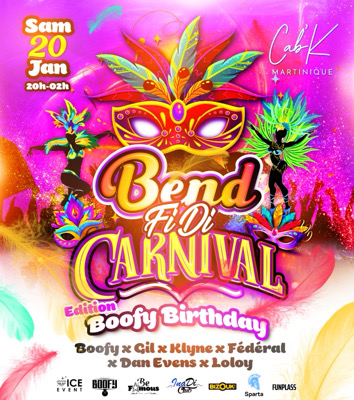 *📌 MARTINIQUE* Ouverture Du Carnaval 2024 💥🥁 *🎭 Ben Fi Di Carnival Is Back 🔥* L’événement incontournable du mois de Janvier #BoofyBirthday 🎉 *Un Line Up Monstrueux 😲🔥* 🦸🏽♂️GIL 🧙🏾♂️KLYNE 🧝🏾♂️ FÉDÉRAL 🧞♀️ DAN EVENS 🧚🏼♀️ LOLOY *Direction le 📌 CAB’K* 🧸 VENTE FLASH 🧸