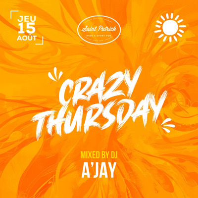 Crazy Thursday Bienvenue dans un monde où les sonorités vous pousseront dans une folie extrême. DJ A’jay a prévu de tout retourner Bref ce sera totalement fou Prenez vos pass et soyez prêt car ce sera incroyablement chaud