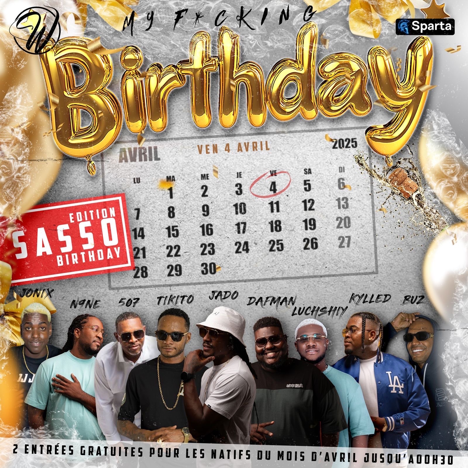 My fucking birthday fais son grand retour vendredi 4 avril, venez fêter avec nous l’anniversaire de SASSO, pour l’occasion, l’entrée sera gratuite pour toutes les personnes nées au mois d’avril sous présentation de carte d’identité plus 1 invité. Une Soirées électrique. Nous comptons sur votre présence pour trinquer avec Sasso (le plus souriant d’entre nous lol) . Aux platines les plus grands DJ de la Gwada, 507, Jonix, Jado, Nine . Dafman🎶. kylled. tikito, Wiwi, Luchshiy and more. Prévente dis...