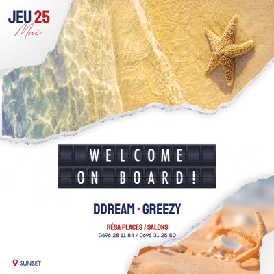 Jeudi 25 Mai dès 20h _Embarquement Imminent Pour un voyage EN BUSINESS _ *WELCOME on BOARD* Ton new concept qui va te faire voyager dans différents lieux Pour notre premier voyage : Destination *Le SUNSET* Aux commandes *DDREAM* & *GREEZY* Un duo complémentaire qui sera satisfaire toutes demandes et exigeances En quête d’aventure ? Récupère ton Invitation valable avant 21h30 BOARDING !!!! By Mike & Boukaaaa Résa uniquement whatsapp : 0696 281184 ou 0696312550 ...