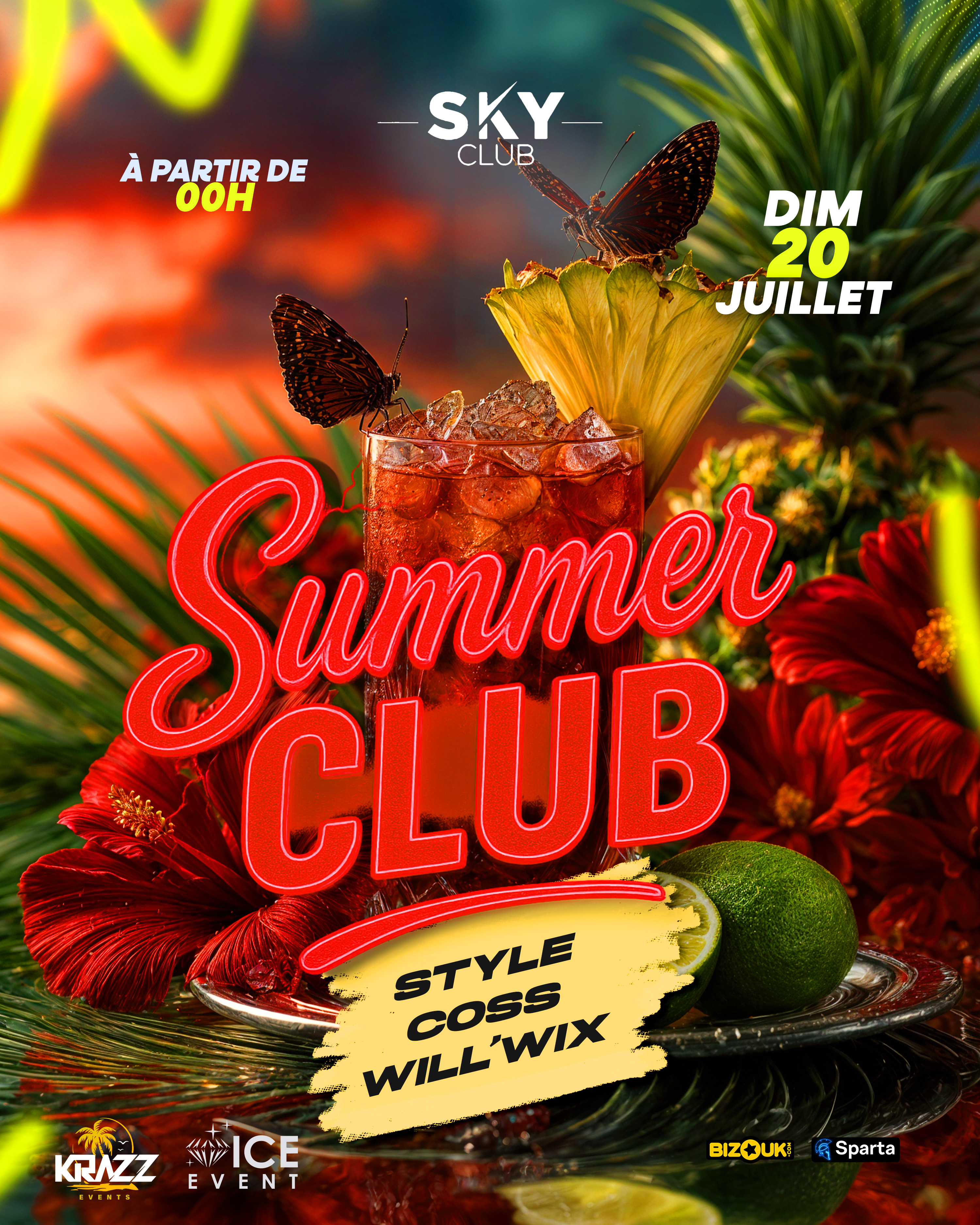 🌴🔥 SUMMER CLUB - DIMANCHE 20 JUILLET au SKY CLUB 🔥🌴 Prépare-toi pour la soirée la plus fraîche de l’été ! Le Sky Club te donne rendez-vous ce dimanche 20 juillet, de 00h à 4h du matin pour une ambiances enflammées ☀️🍹💃 💥 AU PROGRAMME : 🎧STYLE – COSS – WILL WIX 📍 Sky Club 🕛 De 00h à 04h 🎉 Dress code : Summer & Chill 🔥 Réserve ta table maintenant – les places vont partir vite ! 📲 Infos & résa : @krazz_events ‼️TENUES CORRECTES EXIGÉES‼️