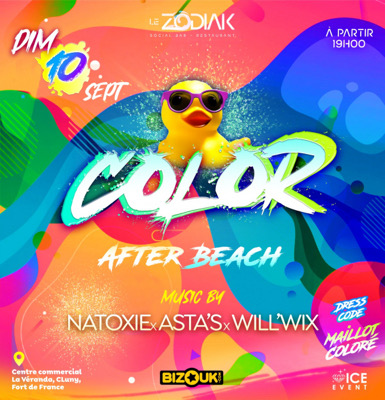 La COLOR AFTERBEACH Ton Dimanche après la plage très coloré (dress code) et PRESSION avec Djs NATOXIE x ASTA’S x WILL’WIX Récupère ton invitation valable jusqu'à 21h30 sur Bizouk (Consommation OBLIGATOIRE) Accès strictement interdit aux mineurs, pièce d'identité obligatoire Le ZODIAK Bar Centre commercial la Véranda, à Cluny, Fort de France.