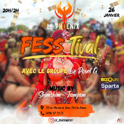 Vendredi 26 janvier à partir de 20h, pour la fess’tival on T'attend au * Phœnix * Fess’tival avec Dj Shimshim Dj Jamjam & Le groupe point G Mets ta meilleures tenue de carnaval Et viens t’amuser Tenue correcte exigée : Pas de casquette , pas de jogging , pas de sandales et pas de short ! Esprit correct recommander Consommation obligatoire Arrivez tôt Réserve Ton Salon VIP dès maintenant au 06 96 07 35 15