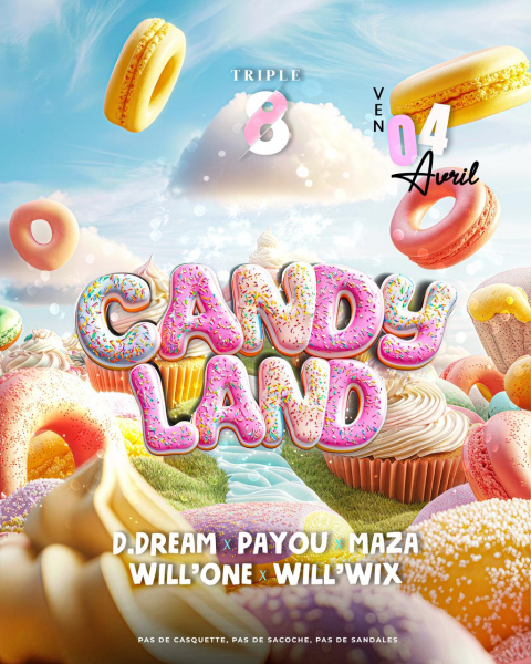 CANDY LAND Le 4 avril, le Triple 8 se transforme en un véritable paradis sucré pour une nuit des plus gourmandes ! Plongez dans un univers féerique où donuts, macarons et cupcakes flottent dans les airs, où chaque détail vous transporte dans un rêve sucré. Une soirée pleine de couleurs, de saveurs et de surprises, avec une ambiance aussi festive qu’ensorcelante ! Aux platines : D.DREAM x PAYOU x MAZA WILL’ONE x WILL’WIXLaissez-vous emporter par une décoration immersive qui éveillera tous vos sen...
