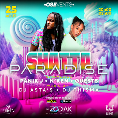🍭 SHATTA Paradise 🍭 Le Paradis du Shatta la soirée la plus Shatta de tes vacances. Direction @le_zodiak.mq 🏎 Sors ta tenue rose et blanc la plus sexy pour back it Up toute la nuit. Active ton mode Shatta 😮💨? Au programme Showcase 🎤 de @panikj972 qui va présenter son dernier projet Paradise en Feat avec Scrapy Magic Feat Magic Terrell Elymoor Select Slk et son hit Nou en lé sa 🎶 Plus un Big showcase de N’Ken avec le hit de l’été Walpa 2 Sans maman sans papa 🔥😧 Music by : ...