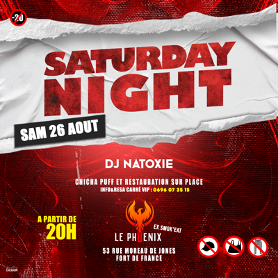 Ce *samedi 26 Août* à partir de 20h, on t’attend au *📍 Phœnix * pour la « Saturday Night avec *Dj Natoxie* Maximum d'ambiance pour bien clôturer les vacances 🥵 Tenue correcte exigée : Pas de casquette , pas de jogging , pas sacoches ! Esprit correcte recommander ⚠️Arrivez tôt !!! *Réserve Ton Salon VIP* dès maintenant au 06 96 07 35 15