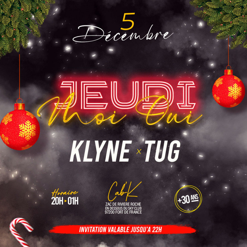 JEUDI MOI OUIIIIIII C’est ce *Jeudi 05 Décembre de 20h à 1h aux platines @djklyne x @djtug un lieu le Cab’k pour une pure décompression INVITATION VALABLE jusqu’à 22h après 10€* Réservation de table : 0696679695