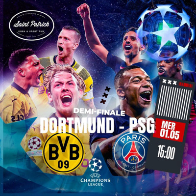 SPORT BAR •SAINT PATRICK o CHAMPIONS LEAGUE Demi finale aller . * MERCREDI 1 er MAI _Ouverture des portes à 14 h 00._ ~ DORTMUND ~ PSG Entrée gratuite . Info ou resa de salon : 0696194006 ( WhatsApp )