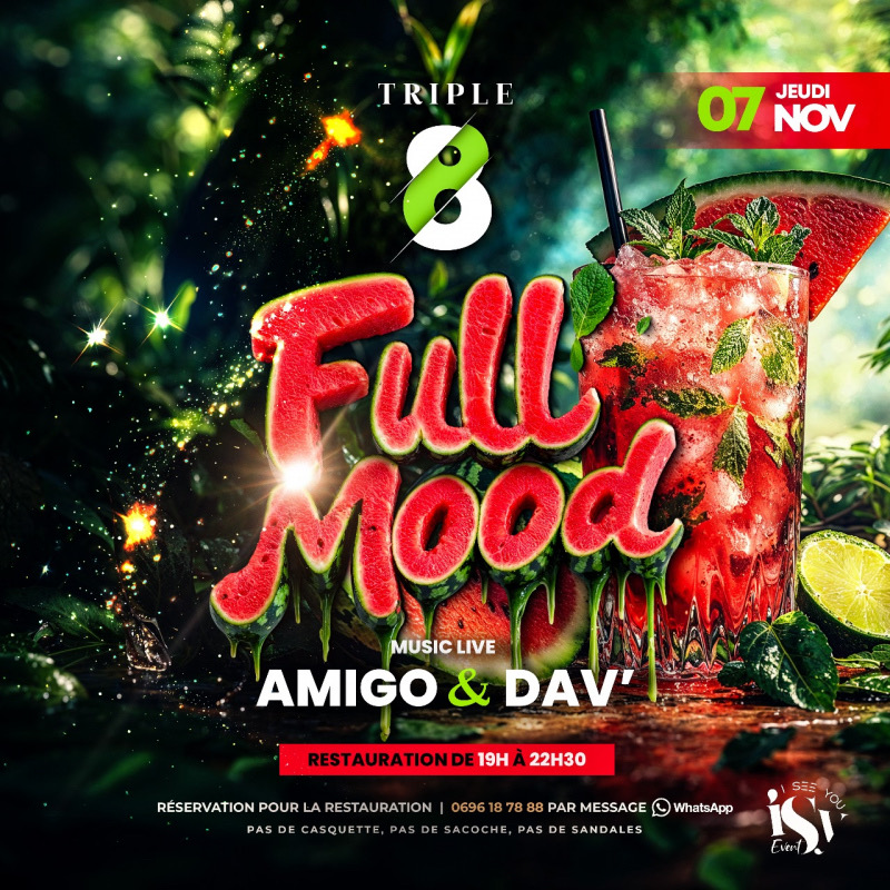 JEUDI 7 Novembre ton rdv du jeudi de 18h30 à 00H !! Full Mood •••••••••••••••••••••••••• #OuvertureDesPortes 18h30 Restauration à table disponible de 19h à 22h30 puis snacking de 22h30 à 23h30 LIEU : TRIPLE8 (ex Bout du Monde) TENUES ET ESPRITS CORRECTS EXIGÉS; LA DIRECTION SE RÉSERVE LE DROIT D'ENTREE. Il est conseillé d'arriver tôt car une invitation ne garantit pas le droit d'accès et privilégier le covoiturage