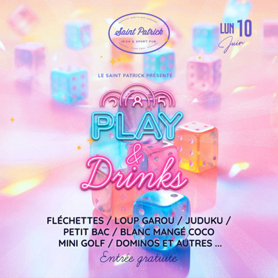 PLAY AND DRINK’S* le Bar Saint Patrick vous donne rendez vous pour un after work 100% jeux ce lundi 10 juin de 19h à minuit . Une ambiance conviviale , des jeux de société a disposition , Dominos Fléchettes UNO , Mini golf et bien d’autres .. St Patrick’s Bar : Cc Didier Plaza - Route de Didier - FdF Entrée gratuite