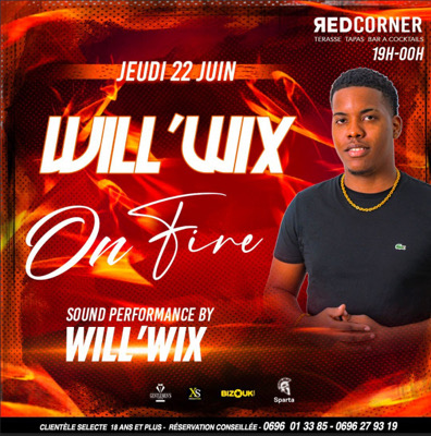 * JEUDI 22 JUIN* dès 19h la *TEAM XS* et leurs *Hôtesses sexy* te convient au *REDCORNER* pour leur soirée * WILL WIX On Fire * *Dj WILL WIX * mettra un Maximum d'ambiance en mode Shatta ARRIVEZ TÔT . *Réserve Ton Salon dès maintenant* MANU 0696.013385 _ La direction se réserve EXCLUSIVEMENT le droit d'entrée._