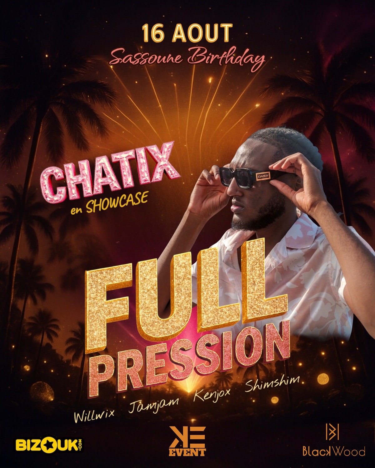 🎉 FULL PRESSION – ÉDITION SASSOUNE BIRTHDAY 🎉 🔥 Vendredi 16 Août 🔥 Ce 16 août, on fait sauter les compteurs pour une soirée explosive en l’honneur de l’anniversaire de Sassoune ! Ambiance luxueuse, vibes calientes, et une pression maximale jusqu’au bout de la nuit 🥂 🎧 Aux platines, une équipe de choc pour faire vibrer le dancefloor : WILLWIX – JAMJAM – KENJOX – SHIMSHIM Prépare-toi à danser non-stop sur les meilleurs sons caribéens, afro, hip-hop et dancehall 🔥 📍 Lieu : BLACKWOOD 🕗 H...