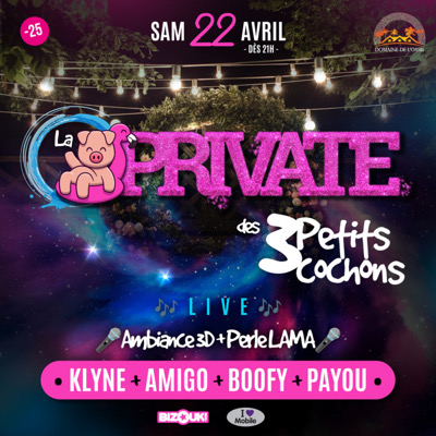 Y adan Nous revoici, nous revoilà… Vos 3 PETITS COCHONS préférés reviennent pour une nouvelle aventure : la 2ème édition de " LA PRIVATE" Toujours en mode Garden Nocturne Chic autour de la piscine De 21h à 04h (svp arrivez dès l'ouverture) Niveau son, vous connaissez déjà => des 90's à aujourd'hui, mais LA PRIVATE c’est surtout : LA SPÉCIALE BIG TUBES ET DUBPLATES !!! DJ KLYNE_DJ BOOFY_DJ AMIGO_DJ PAYOU vont créer les ondes de choc dans la piscine LA PRIVATE c'est aussi votre moment live...