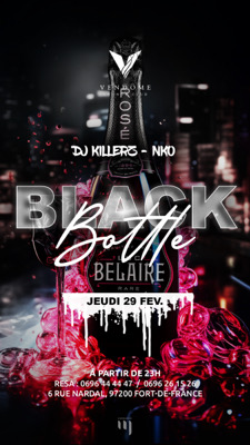 JEUDI 29 FEVRIER * La _*BLACK BOTTLE by Luc BELAIRE_* (Tous les Jeudis au _VENDOME_ 23h-04h) Warm up a partir de 23h : *_Dj KILLERZ x N’KO* liste sur BIZOUK : *Info/Résa :* 0696444447 / 0696261526
