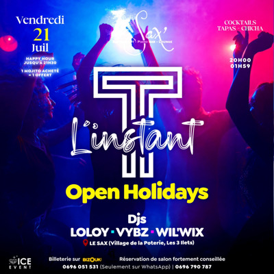 Rejoins le cercle de L'instant T... Vendredi 21 Juillet, OPEN HOLIDAYS G00D VIBES ONLY BY Djs LOLOY x VYBZ x WILL'WIX Clientèle multigénérationelle Happy Hour jusqu'à 21h30 1 MOJITO ACHETÉE = 1 OFFERT 0696 051 531 - 0696 790 787 (Seulement sur WhatsApp)