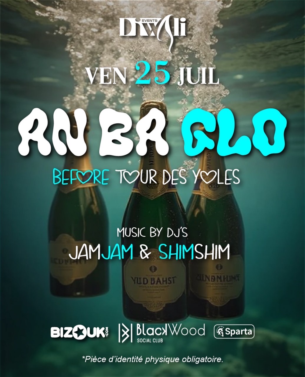 🎉 AN BA GLO – BEFORE DU TOUR DES YOLES ! 🌊 📅 Vendredi 25 juillet ✨ Élégance tropicale & vibes urbaines Avant le grand départ du Tour, Diwali Events t’invite à AN BA GLO, le before incontournable de l’été 🔥 🌴 Ambiance 100% Martinique, dans un cadre chic & stylé 🥂 🎧 DJ JamJam vs DJ ShimShim – un duel musical explosif jusqu’à 2h du matin 💣🎶 🔥 Viens faire monter la pression avant le grand jour !