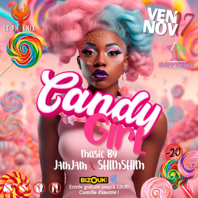 Vendredi 17 novembre à partir de 20h, pour la Candy girl on T'attend au * Phœnix * pour une nouvelle soirée HORS DU COMMUN avec Dj Shimshim DJ jamjam Viens avec un maximum sucre Tenue correcte exigée : Pas de casquette , pas de jogging , pas de sandales et pas de short ! Esprit correct recommander Entrée gratuite jusqu’à 22h30 Arrivez tôt !!! Réserve Ton Salon VIP dès maintenant au 06 96 07 35 15