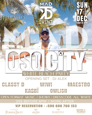 OSOCITY at KALATUA BEACH 📍 Sunday December 17th, MAD EVENTS presents an exclusive White Beach Party featuring OSOCITY at the iconic KALATUA BEACH in Mullet Bay🌴 🕒 Start at 3PM! 🕒 @kalatua.beach Get ready for the internationally famous American DJ OSOCITY, renowned for his mixtapes with millions of views, to ignite our special stage. @osocity Experience a chic Beach Party with beautiful people, great music, and positive vibes. 🥂 💥 KALATUA x MAD EVENTS 💥 🎧 OPEN FORMAT MUSIC by: ...