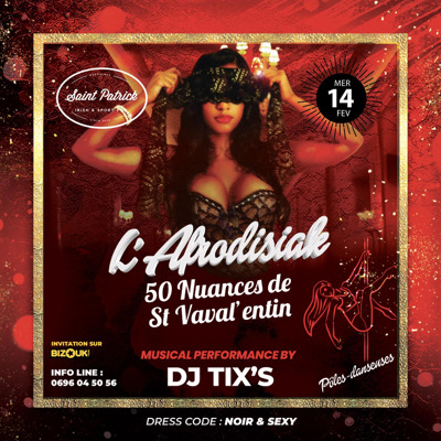 *AFRODISIAK* _SPÉCIALE_ *⚜️50 NUANCES DE ST VAVAL'ENTIN⚜️* Vaval se meurt mais on est toujours la !!! Pour ce 14 février 2024 dernière ligne droite du carnaval, on se lâche!!!! Bien sur que nos *poles danseuses seront la pour des shows qui vont encore plus pimenter notre soirée*🥳🥳 🎶 Notre chauffeur d'ambiance: *Dj TIXS* *Dress code*: Viens avec ton *déguisement noir des plus sexy* 🤤😍🤤 ( *Si tu arrives tôt et que tu respectes le dress code gagne ton shooters*...