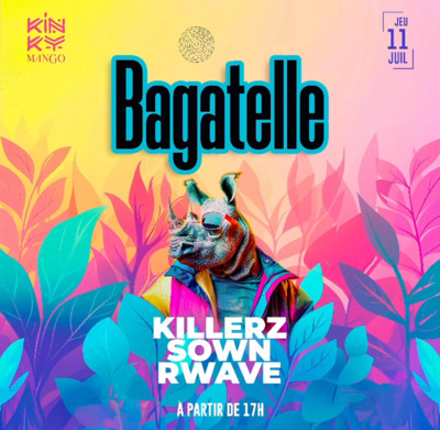 Welcome to _*BAGATELLE*_, Ce Jeudi 11 Juillet au Kinky Mango On démarre sur la Terrasse dès 17h avec dj _RWAVE_ jusqu’à 22h30 Et à partir de 20h, on fait chauffer la room avec _Dj Killerz et Dj Søwń_. Récupère ton invitation + 1 shooter offert valable avant 21h ou ton invitation seule valable jusqu’à la fin. Tenue correcte exigée, on se voit jeudi pour un début de week-end chaud bouillant
