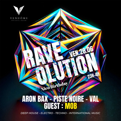 RAVE’OLUTION Édition Spéciale « Nico Birthday » Concept 100% Music électro- Deep House, Techno & international Music …. Ton rdv bi-mensuel au Vendôme, Ce Vendredi 28 Juin de 23h à 4h pour une ambiance complètement déjantée dans ce temple de la fête Martiniquaise Aux Platine ce Samedi on retrouve: Aron Bax - Val - Piste Noir et en Guest: mob Entrée gratuite jusqu’à 2h avec ton invit Récupère la sur Bizouk ou Sparta