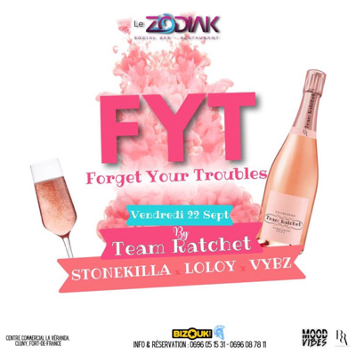 Forget Your Troubles Ce Vendredi 22 Sept Au Zodiak ! La Team Ratchet te présente la : #FYT Le Concept est simple… En couple, entre amis ou même seul DJs Stonekilla Loloy & Vybz te feront oublier tous tes soucis du quotidien Un seul mot d’ordre : DÉCOMPRESS’ ! #FYT #TeamRatchet #Zodiak #Amizman #Bordeling