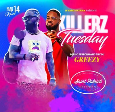 KILLERZ TUESDAY Ton Rdv du mardi comme d’hab avec Du gros son HIP HOP & INTERNATIONAL _ DJ. GREEZY On t’offre ta bouteilles de Vin : avec une bouteille de vin offerte aux groupes de 5 pers avant 21 h 30 Info ou resa : 0696194006 C.C Didier Plaza FdF . 17h - 00 h Tenue correcte exigée . Soyez beau ! Soyez Happy !