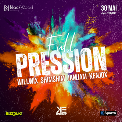 Hello la Team Pression « La Full Pression » au BLACKWOOD Jeudi 30 Mai c’est le bordel organisé façon K’RIBBEAN EVENT Tu connais déjà le concept alors emmène ta team et viens te défouler en compagnie des maîtres de la pression: WILLWIX JAMJAM KENJOX SHIMSHIM Interdit au mineur pièce d’identité obligatoire