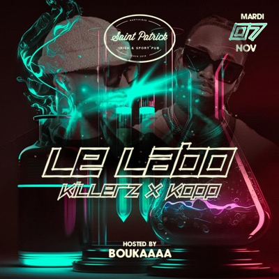 LE LABO MARDI 7 novembre c’est le retour de *KILLERZ & KOPP* aux platines On prend place et on kiffe , c’est ton Rdv musical d’une autre approche . TON AFTERWORK ( ou pas ) du mardi de 19 h 00 à 00 h00 Saint Patrick . KILLERZ et KOPP aux platines . HOSTED BY BOUKAAA Une bouteille de vin offerte aux groupes de 4 femmes ou plus avant 21 h 30 . Entrée gratuite. Arrive tôt on finit à Minuit Info resa salon : 0696194006