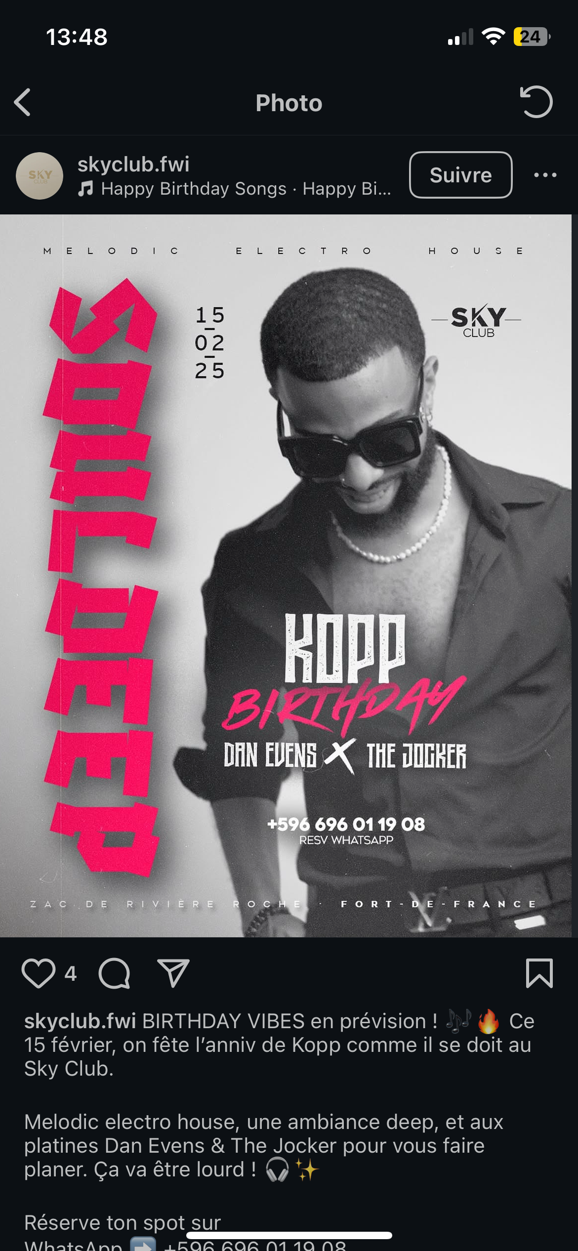 BIRTHDAY VIBES en prévision ! je Ce 15 février, on fête l'anniv de Kopp comme il se doit au Sky Club. Melodic electro house, une ambiance deep, et aux platines Dan Evens & The Jocker pour vous faire planer. Ça va être lourd ! Réserve ton spot sur WhatsApp +596 696 01 19 08.