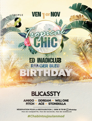 👘🥻 *TROPICAL CHIC ed Inadiclub et Ranger Bleu Birthday* 🎉🎊 Au delà de l'esthétique, le *TROPICAL CHIC* évoque une sensation de vacances, de détente et de joie de vivre. C'est aussi la célébration de la beauté 🤩 *NATURELLE DES CHABINS*🤩 et de l'élégance décontractée. Amoureux des tenues Chic qui combinent la culture tropicale et une touche de sophistication... *LACHEZ-VOUS* 🗓️Vendredi 1er Novembre à partir de 17h 📍Triple 8 🎤En invité : *BLICASSTY* Accompagné par nos Djs Chic : ...