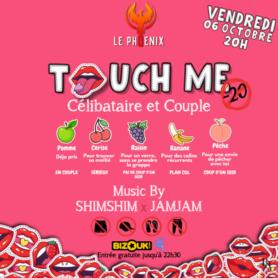 Vendredi 6 octobre à partir de 20h, pour la touch me on T'attend au *📍 Phœnix * pour une nouvelle soirée HORS DU COMMUN TOUCH ME avec Dj Shimshim DJ Jamjam Choisis ton camp ( des bracelets vous seront remis a l’entrée ) Pomme : en couple Cerise : pour trouver sa moitié ( sérieux ) Raisin : prendre un verre pas de coup d’un soir Banane : Plan cul Pêche : coup d’un soir Tenue correcte exigée : Pas de casquette , pas de jogging , pas de sandales et pas de short ! Esprit correct reco...