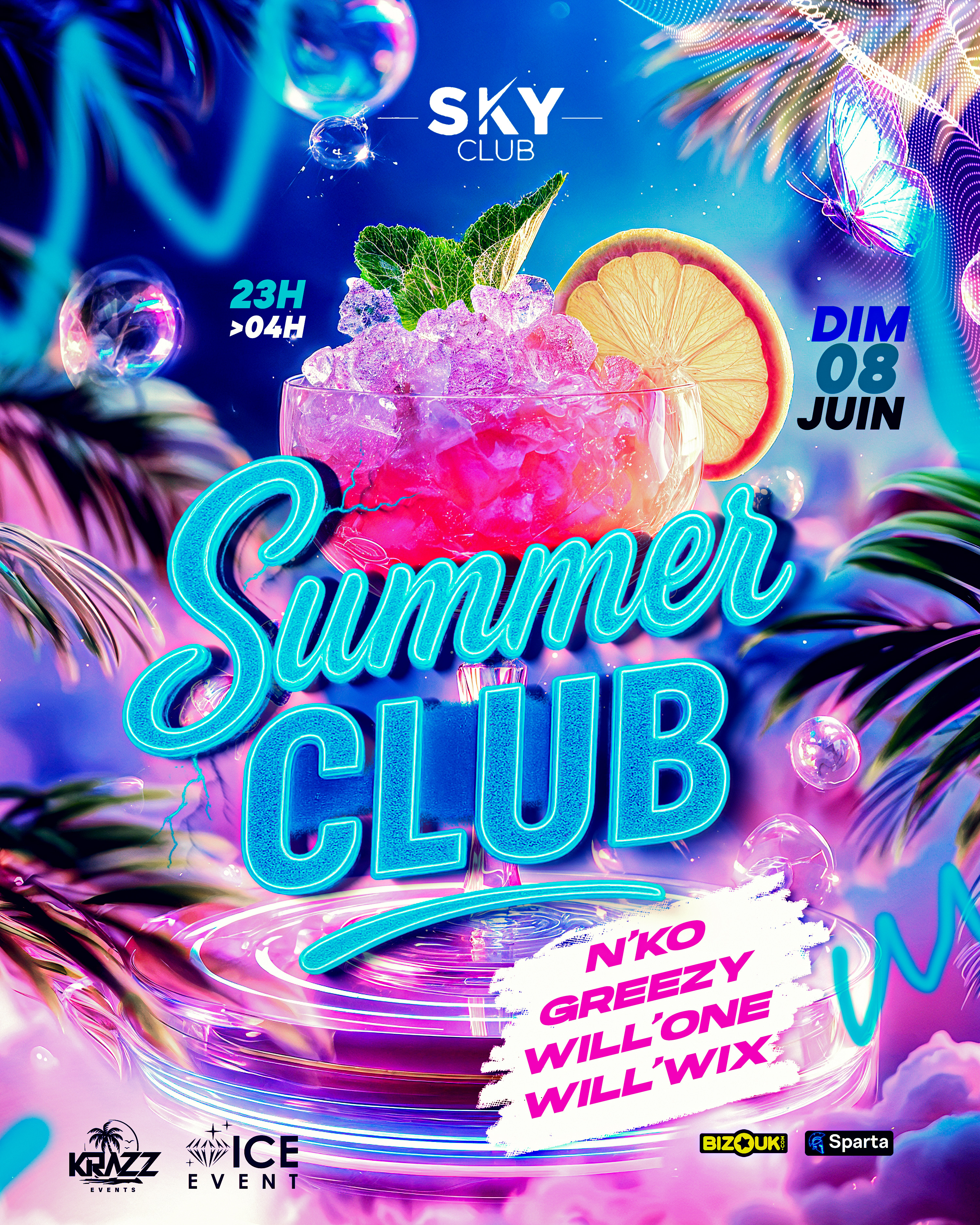 🌴🔥 SUMMER CLUB - DIMANCHE 08 JUIN au SKY CLUB 🔥🌴 (Veille de jour férié – pas d’excuse pour ne pas sortir !) Prépare-toi pour la soirée la plus fraîche de ce début d’été ! Le Sky Club te donne rendez-vous ce dimanche 8 juin, de minuit à 4h du matin pour une ambiances enflammées ☀️🍹💃 💥 AU PROGRAMME : 🎧 N’KO – GREEZY – WILL’ONE – WILL’WIX 📍 Sky Club 🕛 De 23h à 04h 🎉 Dress code : Summer & Chill 🚨 C’est la veille d’un jour férié, donc on fait la fête sans regarder l’heure ! 🔥 Réserve...