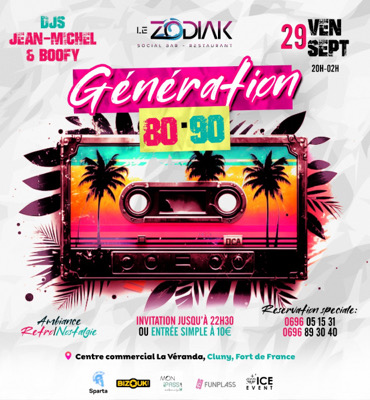 Amateur du répertoire Rétro/Nosta des années 80 et 90 ? • GÉNÉRATION 80-90 • De 20h00 à 02h00 Ambiance assurée par les spécialistes DJs JEAN-MICHEL et DJ BOOFY Le ZODIAK Centre commercial la Véranda à Cluny, FDF Tickets disponibles sur Bizouk, Monipass, Funplass et Sparta Réservation spéciale 0696 051 531