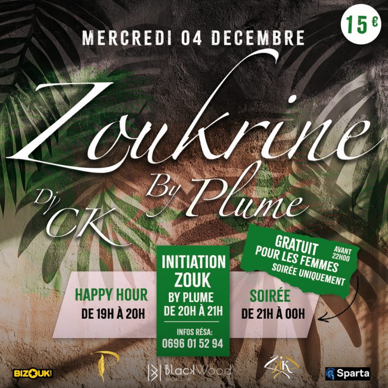 LA ZOUKRINE by Plume_princia !! Au programme : Happy Hour de 19h à 20h Initiation Zouk de 20h à 21h avec Plume_princia et Cédric son partenaire du jour Soirée zouk à partir de 21h avec Dj_Ck aux platines !! Lieu : Blackwood Social Club - Zone Petite Cocote, Ducos
