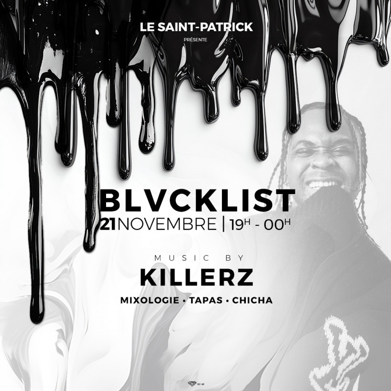 Ce jeudi 21 novembre BLVCKLIST Plongez au cœur de la Blvcklist, un événement exclusif avec DJ KILLERZ Un goût d’interdit, du noir et des cocktails signature. Dress code: Blvck Invitation bizouk valable jusqu’à 21h30 Réservation au 0696 86 39 50 St Patrick’s Bar : Cc Didier Plaza - Route de Didier - FdF