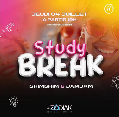 Etudiants , Etudiantes Pour cette première édition, ne manquez pas le duo de choc des Caraibes, les DJ's sensationnels : *SHIMSHIM & JAMJAM !* Récupérez vite votre pass, car ils n'attendent que vous pour enflammer la soirée ! Préparez-vous à une nuit inoubliable de rythmes endiablés et de moments magiques. *La STUDY BREAK