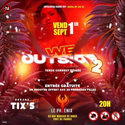 Ce Vendredi 1er Septembre à partir de 20h, la We OutsSide T'attend au 📍 Phœnix pour une nouvelle soirée EXCEPTIONNELLE We OutSide 2 avec *Dj Tix’s* Maximun d'ambiance pour bien clôturer les vacances 🥵 Tenue correcte exigée : Pas de casquette , pas de jogging , pas de sandales ! Esprit correct recommander ⚠️Arrivez tôt !!! *Réserve Ton Salon VIP* dès maintenant au 06 96 07 35 15