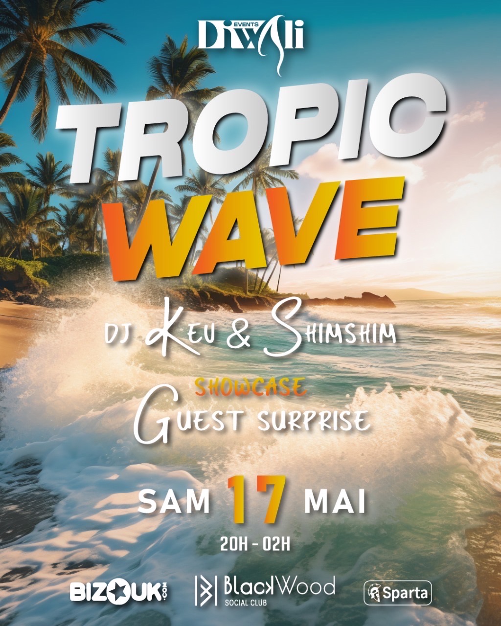 TROPIC WAVE – L’événement à ne surtout pas manquer ! Prépare-toi à vivre la soirée la plus chaude de l’année avec Diwali Events Samedi 17 mai, la Martinique s’embrase dans une ambiance tropicale & explosive ! Aux platines : DJ Kev & DJ ShimShim, prêts à enflammer la piste toute la nuit Et attention… Un(e) artiste surprise de TRÈS haut niveau viendra livrer une performance exclusive