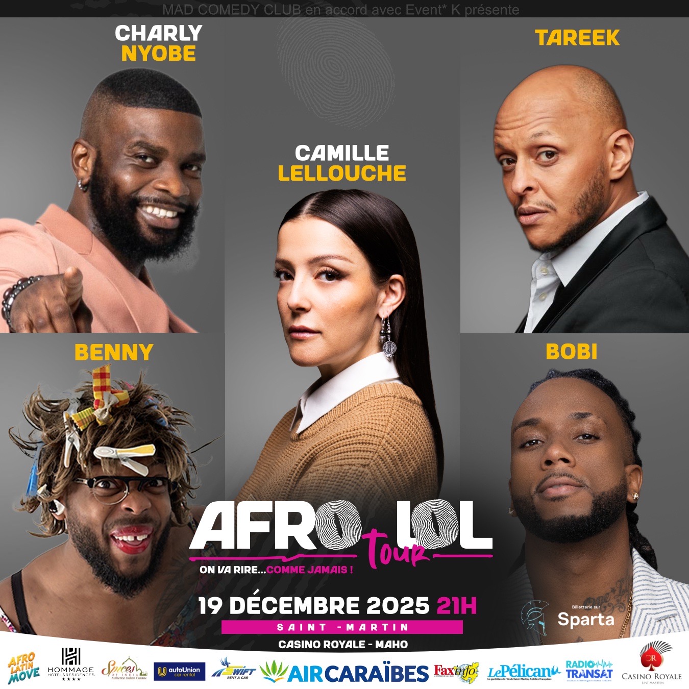 ✨ AFRO LOL – Ils vont te faire rire comme jamais Présenté par Event*K en partenariat avec MAD COMEDY CLUB ✨ Le plus gros plateau d’humoristes qu’ait connu Saint-Martin depuis plus de 10 ans. Cinq artistes, cinq univers, une seule mission : te faire rire comme jamais. AFRO LOL, c’est la preuve qu’au-delà de nos origines, de nos cultures ou de nos opinions… le fou rire reste un langage universel. 🎤 Sur scène : ✨ Camille Lellouche – +2M d’abonnés, révélée par The Voice, passée par l’Olympia, ...
