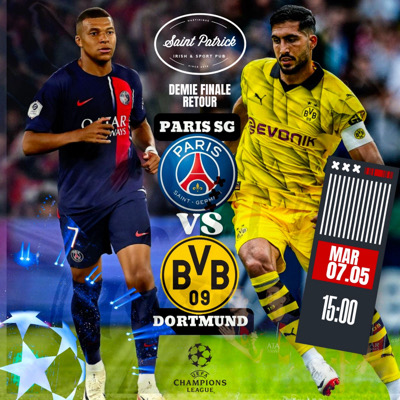SPORT BAR SAINT PATRICK CHAMPIONS LEAGUE Demi finale retour . * MARDI 7 MAI Ouverture des portes à 14 h 00. - PSG - DORTMUND - Entrée gratuite . Info ou resa de salon : 0696194006 ( WhatsApp ) C.C Didier Plaza FdF
